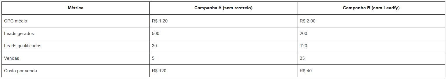 Muita gente ainda avalia o sucesso das campanhas pelo custo por clique. Mas essa métrica, isoladamente, não diz nada. O que realmente importa é o custo por lead qualificado e, principalmente, o custo por venda efetiva.